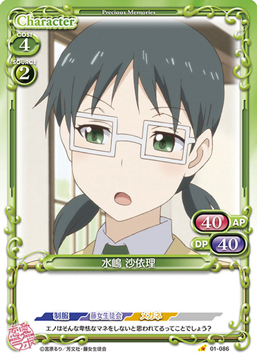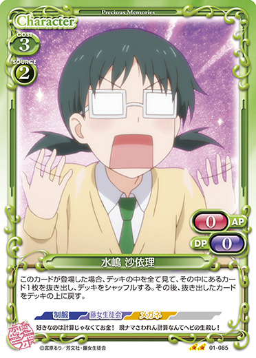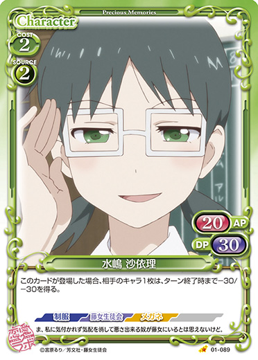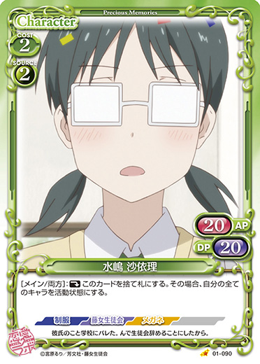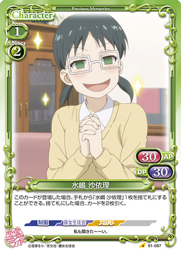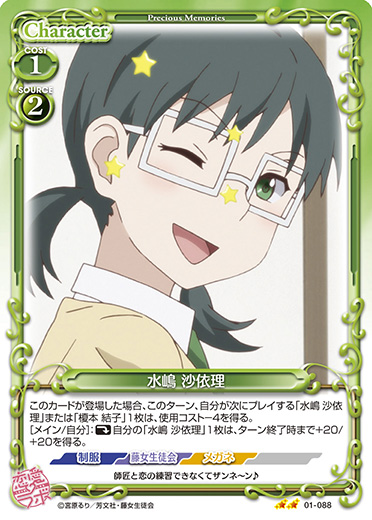 | このカードが登場した場合、このターン、自分が次にプレイする「水嶋 沙依理」または「榎本 結子」1枚は、使用コスト-4を得る。[メイン/自分]:《休》自分の「水嶋 沙依理」1枚は、ターン終了時まで+20/+20を得る。 | ||
