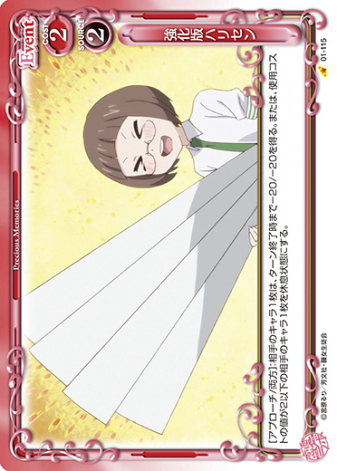 | [アプローチ/両方]:相手のキャラ1枚は、ターン終了時まで-20/-20を得る。または、使用コストの値が2以下の相手のキャラ1枚を休息状態にする。 | ||