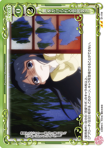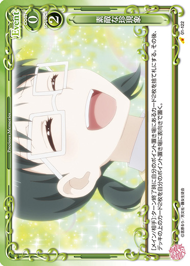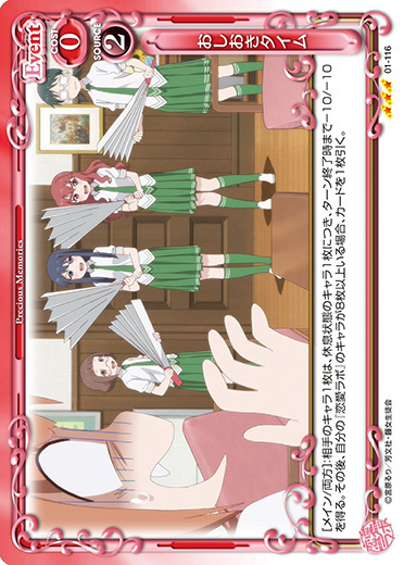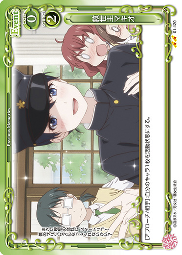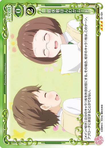 | [メイン/相手]:自分の『恋愛ラボ』のキャラ1枚と相手のキャラ2枚を休息状態にする。その場合、ターン終了時にそのキャラを活動状態にする。 | ||