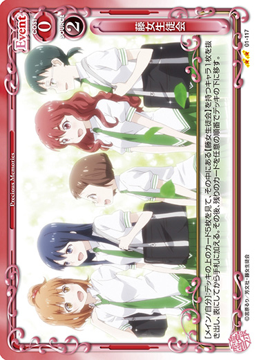 | [メイン/自分]:デッキの上のカード5枚を見て、その中にある【藤女生徒会】を持つキャラ1枚を抜き出し、表にしてから手札に加える。その後、残りのカードを任意の順番でデッキの下に移す。 | ||