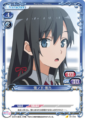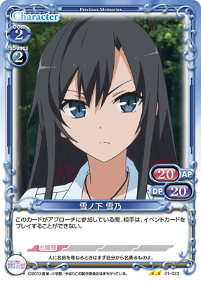 | このカードが登場した場合、手札から「雪ノ下 雪乃」1枚を捨て札にすることができる。捨て札にした場合、カードを2枚引く。 | ||