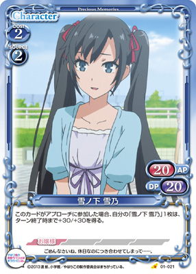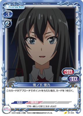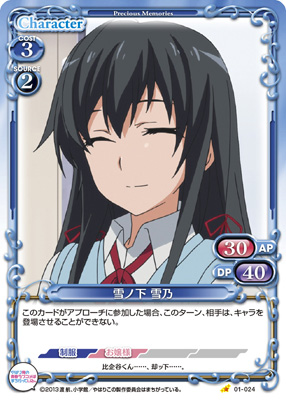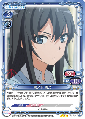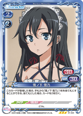 | このカードがアプローチに参加した場合、自分の「雪ノ下 雪乃」1枚は、ターン終了時まで+30/+30を得る。 | ||