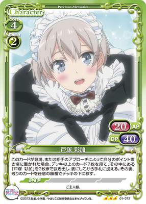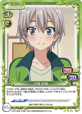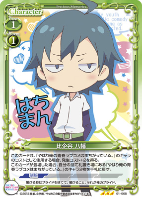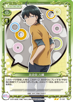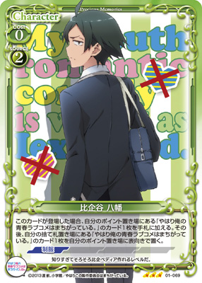 | このカードが登場した場合、このターン、自分が次にプレイする『やはり俺の青春ラブコメはまちがっている。』のキャラ1枚は、使用コスト-4を得る。 | ||