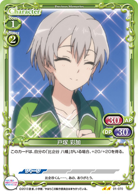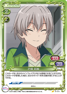 | このカードが登場、または相手のアプローチによって自分のポイント置き場に置かれた場合、デッキの上のカード7枚を見て、その中にある「戸塚 彩加」を2枚まで抜き出し、表にしてから手札に加える。その後、残りのカードを任意の順番でデッキの下に移す。 | ||