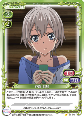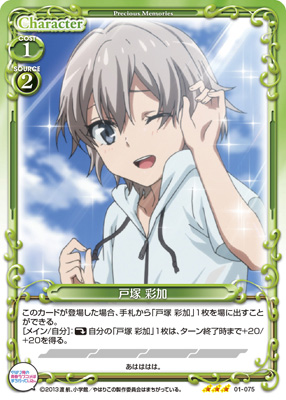 | このカードが登場した場合、デッキの中を全て見て、その中にある『やはり俺の青春ラブコメはまちがっている。』のキャラを2枚まで捨て札にすることができる。 | ||