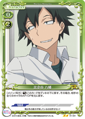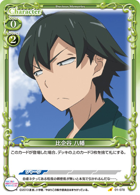 | このカードが登場した場合、デッキの上のカード4枚を見て、その中にある「比企谷 八幡」1枚を抜き出し、表にしてから手札に加える。その後、残りのカードを任意の順番でデッキの下に移す。 | ||