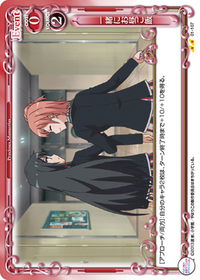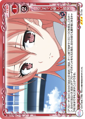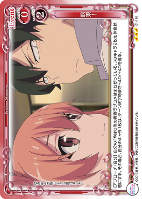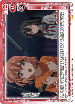 | [アプローチ/自分]:自分の『やはり俺の青春ラブコメはまちがっている。』のキャラ2枚を休息状態にする。その場合、自分のキャラ1枚は、ターン終了時まで+40/+40を得る。 | ||