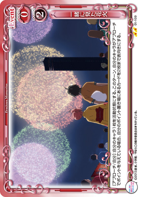| [アプローチ/自分]:自分のキャラ1枚を活動状態にする。このターン、自分のキャラがアプローチでポイントを与えている場合、自分の捨て札置き場にあるキャラ1枚を手札に戻すことができる。 | ||
