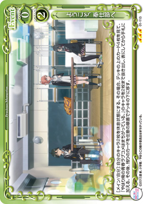 | [アプローチ/自分]:自分のキャラ1枚を活動状態にする。このターン、自分のキャラがアプローチでポイントを与えている場合、自分のポイント置き場にあるカードを2枚まで表向きにする。 | ||