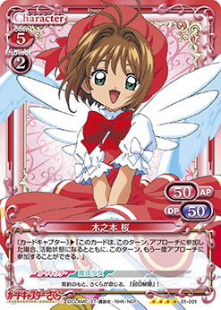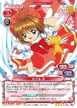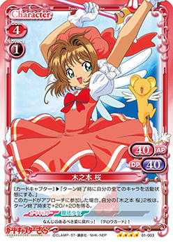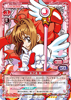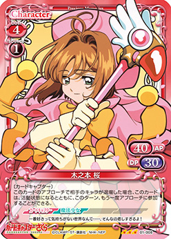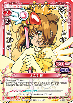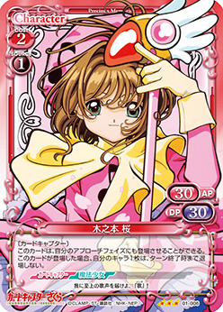 | 〔カードキャプター〕▸「このターン、自分が次にプレイする『カードキャプターさくら』のキャラ1枚は、使用コスト-2を得る。」このカードがアプローチまたは妨害に参加した場合、相手のキャラ1枚のAPまたはDPの値を、元に戻す。 | ||