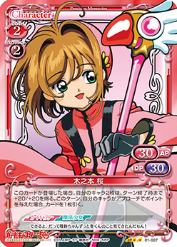 | 〔カードキャプター〕▸「このターン、自分の「木之本 桜」がアプローチに参加した場合、カードを1枚引く。」このカードは、アプローチに参加した場合、ターン終了時まで+30/+30を得る。 | ||