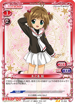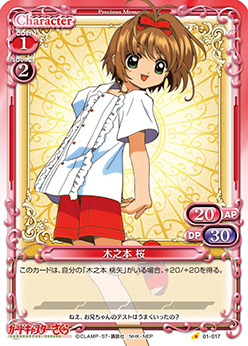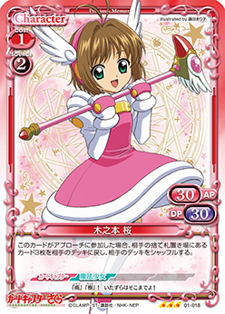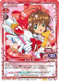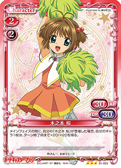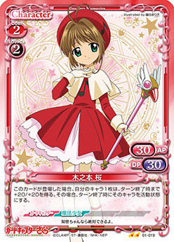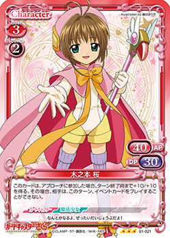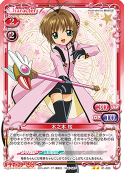 | メインフェイズの間に、自分の「木之本 桜」が登場した場合、自分のキャラ1枚は、ターン終了時まで+20/+20を得る。 | ||