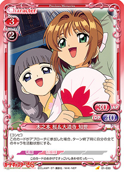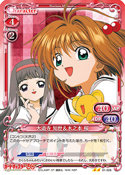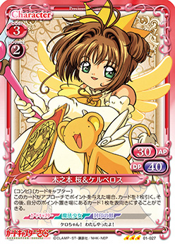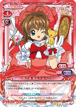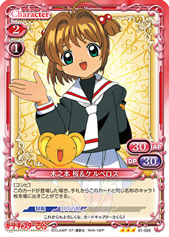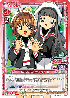 | 自分の【カードキャプター】を持つキャラがアプローチでポイントを与えた場合、キャラ1枚は、ターン終了時まで+20/+20を得る。[メイン/自分]:《0》自分の「木之本 桜」1枚のAP/DPの値を、ターン終了時まで40/40に変更する。 | ||