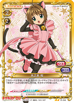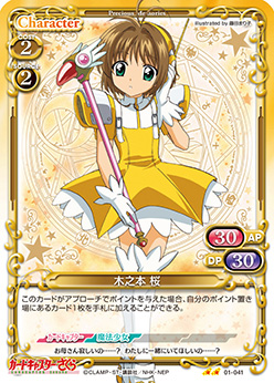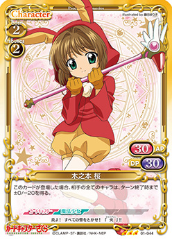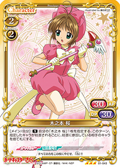 | このカードが登場した場合、このターン、自分が次にプレイする「木之本 桜」1枚は、使用コスト-3を得る。このカードは、自分の「木之本 桜」がいる場合、+20/+20を得るとともに、ターン終了時に活動状態になる。 | ||