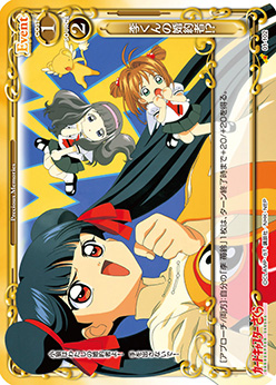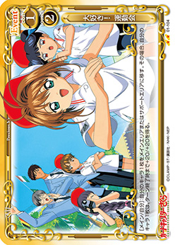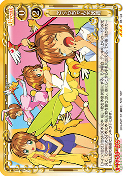 | [メイン/自分]:任意の枚数の自分の『カードキャプターさくら』のキャラを休息状態にする。その場合、自分の「木之本 桜」1枚は、休息状態にしたキャラ1枚につき、+10/+10を得る。 | ||