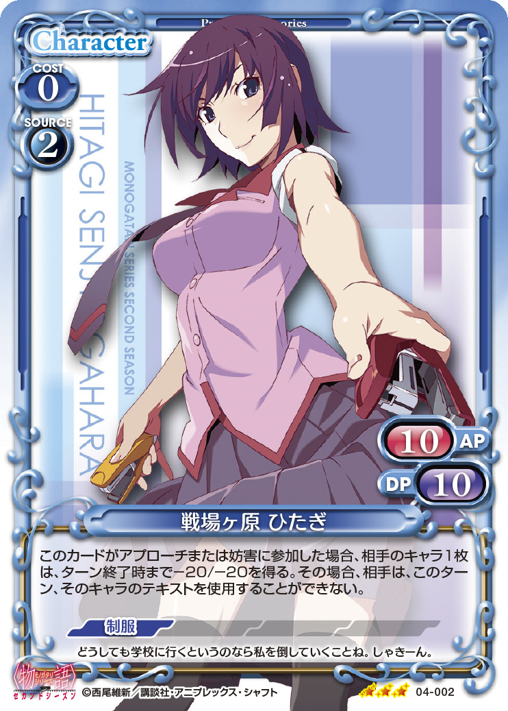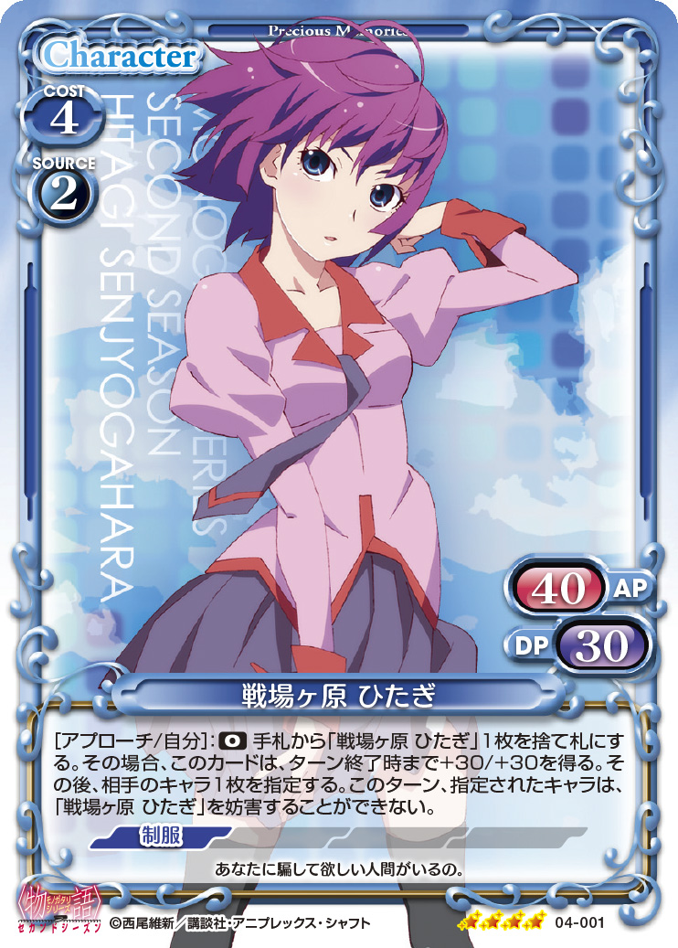 | [アプローチ/自分]:《0》手札から「戦場ヶ原 ひたぎ」1枚を捨て札にする。その場合、このカードは、ターン終了時まで+30/+30を得る。その後、相手のキャラ1枚を指定する。このターン、指定されたキャラは、「戦場ヶ原 ひたぎ」を妨害することができない。 | ||
