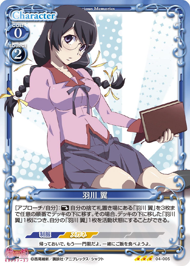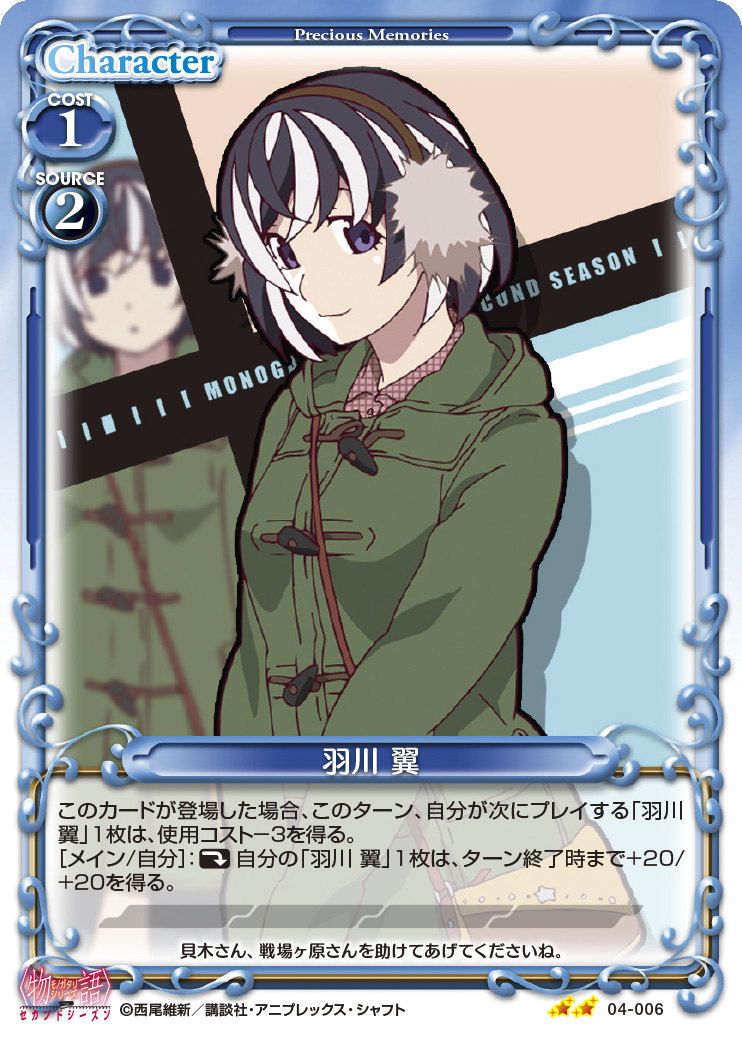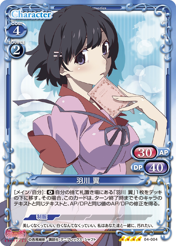 | [メイン/自分]:《0》自分の捨て札置き場にある「羽川 翼」1枚をデッキの下に移す。その場合、このカードは、ターン終了時までそのキャラのテキストと同じテキストと、AP/DPと同じ値のAP/DPの修正を得る。 | ||