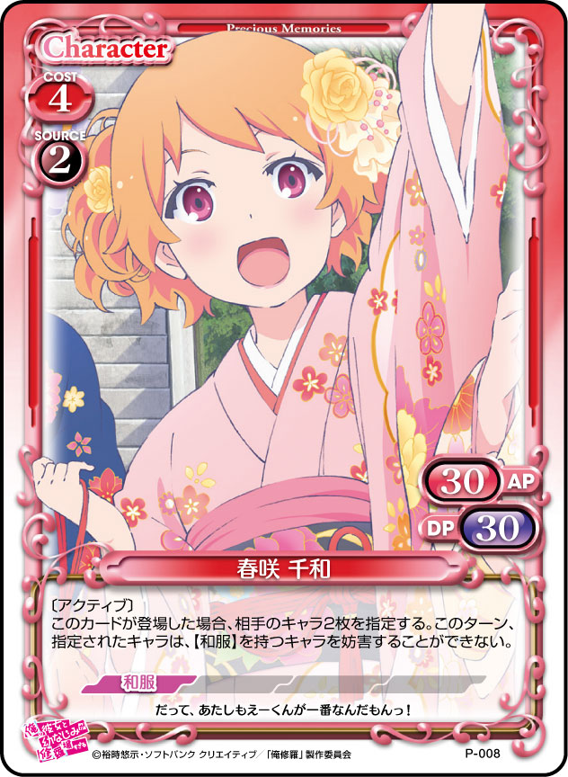 | 〔アクティブ〕 このカードが登場した場合、相手のキャラ2枚を指定する。このターン、指定されたキャラは、【和服】を持つキャラを妨害することができない。 | ||