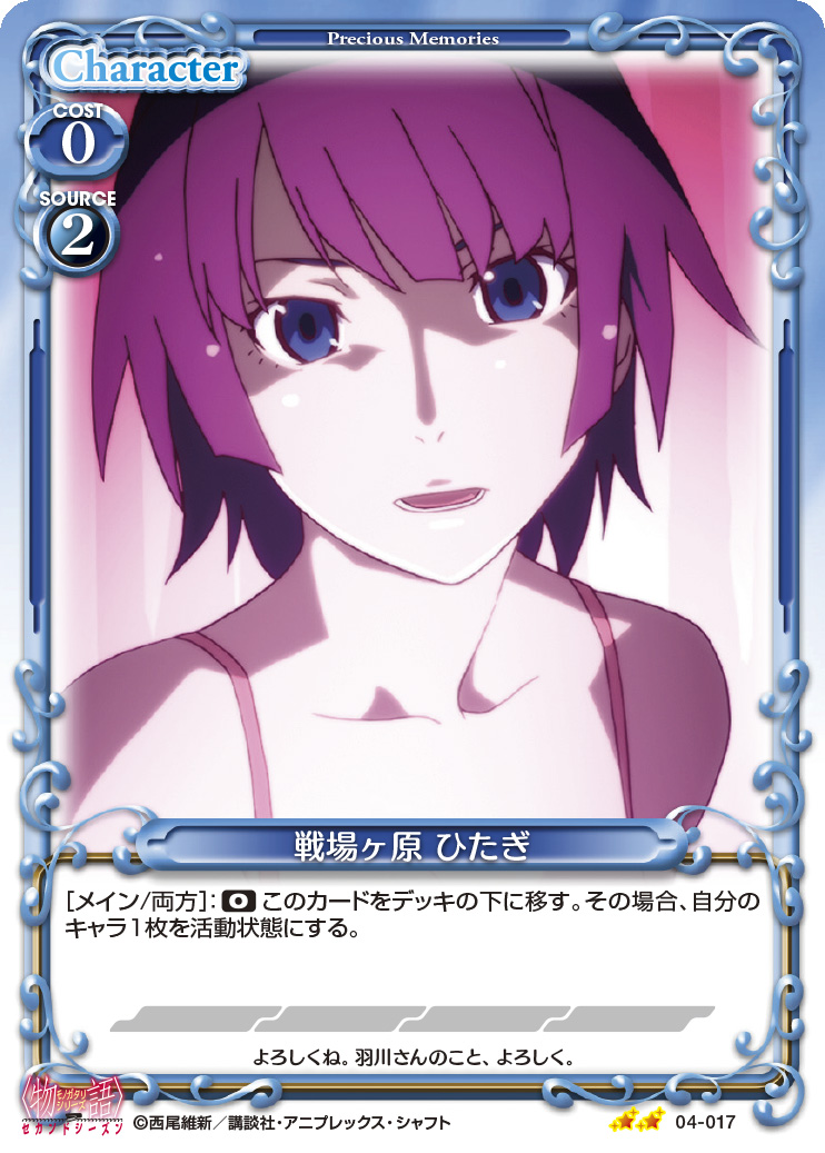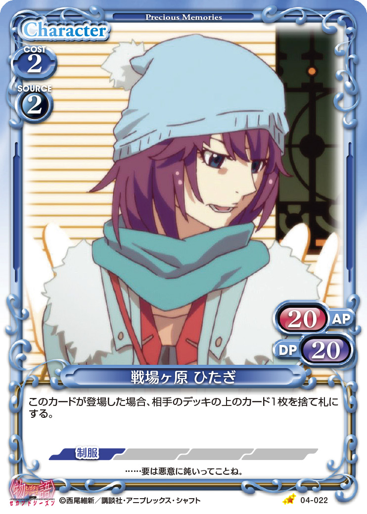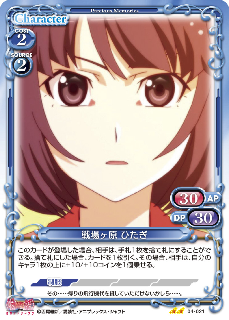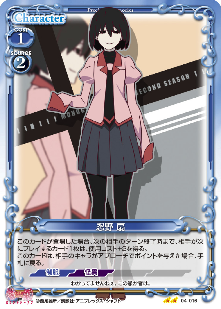 | このカードが登場した場合、このターン、自分が次にプレイするキャラ1枚は、使用コスト-2を得る。 | ||