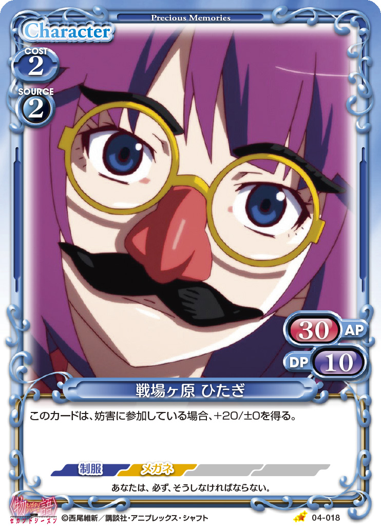 | このカードが登場した場合、相手は、手札1枚を捨て札にすることができる。捨て札にした場合、カードを1枚引く。その場合、相手は、自分のキャラ1枚の上に+10/+10コインを1個乗せる。 | ||