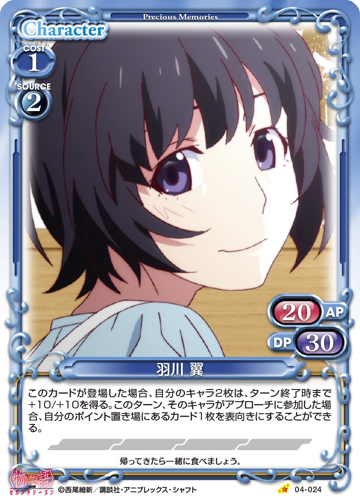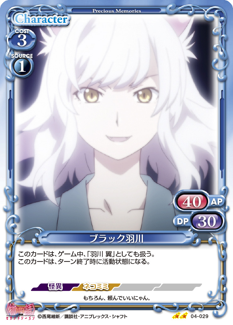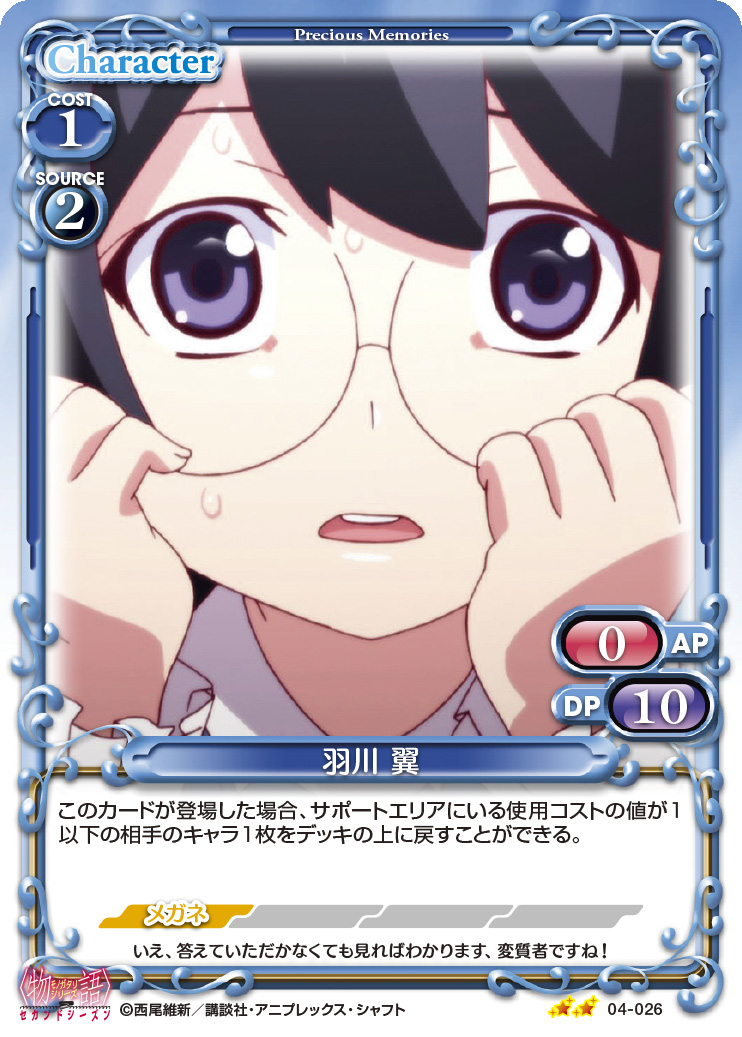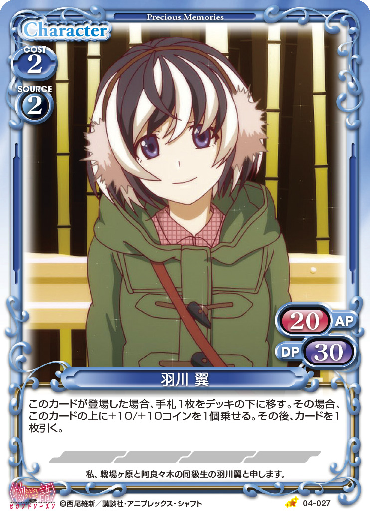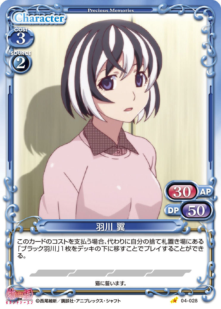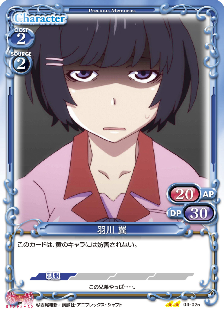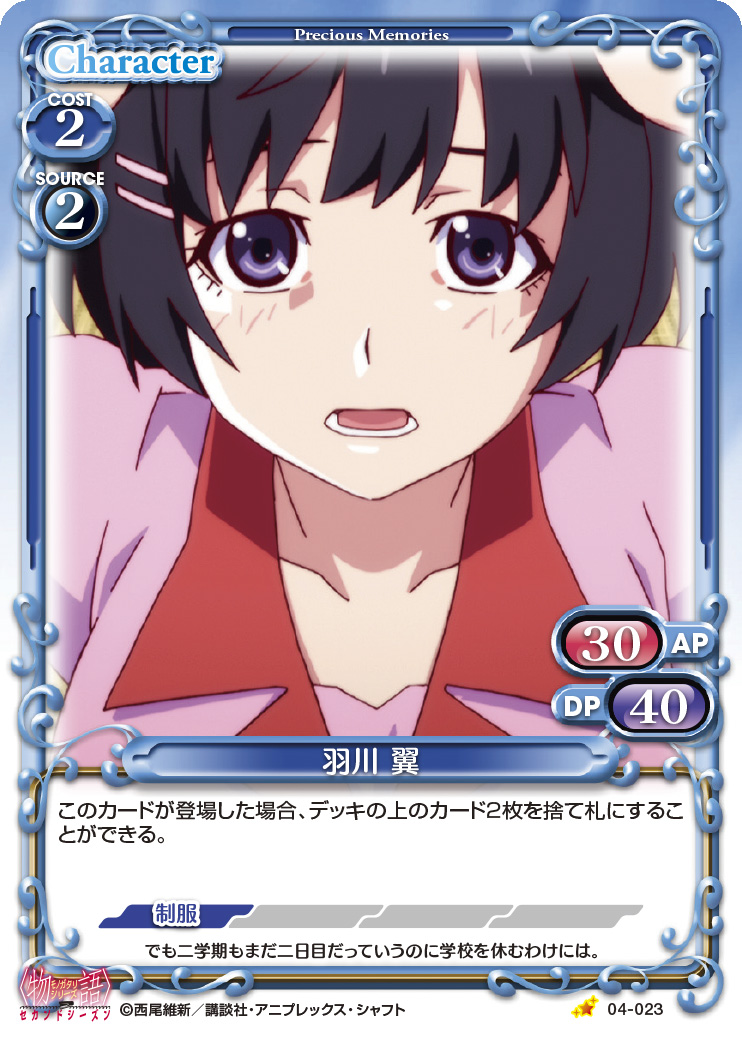 | このカードは、ゲーム中、「羽川 翼」としても扱う。このカードは、ターン終了時に活動状態になる。 | ||