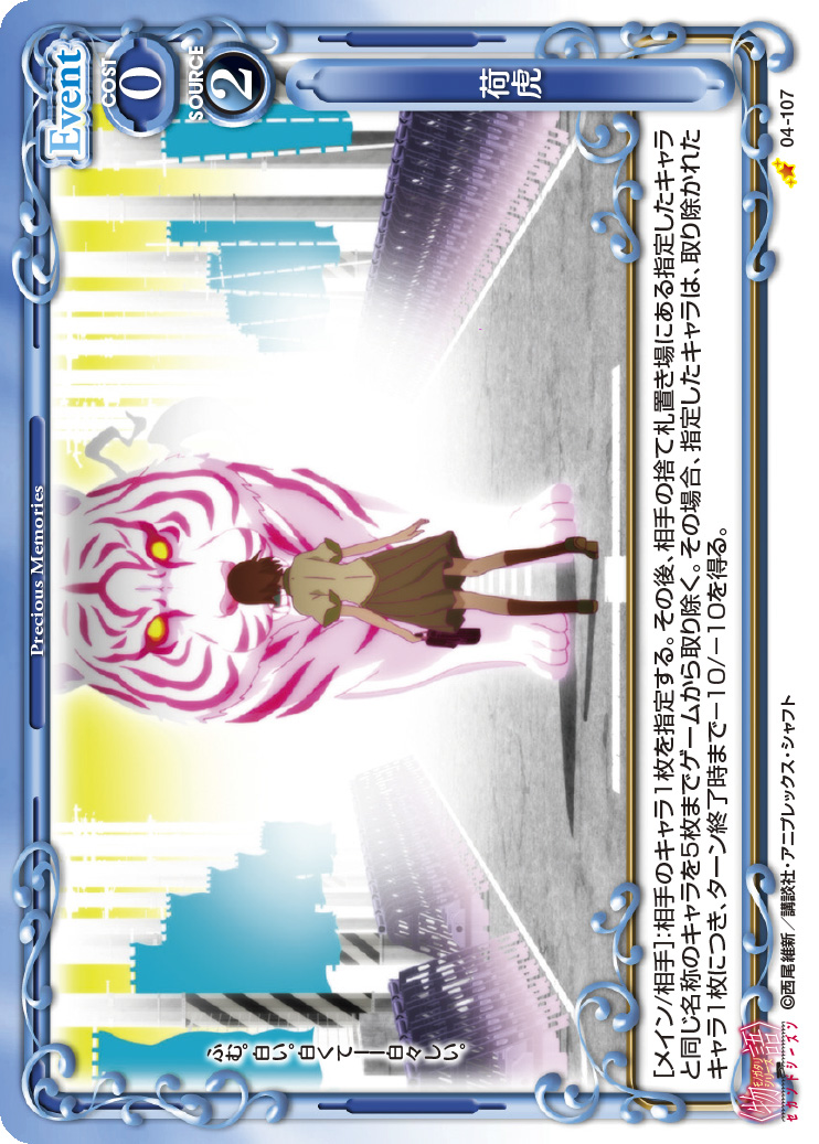 | [メイン/相手]:相手のキャラ1枚を指定する。その後、相手の捨て札置き場にある指定したキャラと同じ名称のキャラを5枚までゲームから取り除く。その場合、指定したキャラは、取り除かれたキャラ1枚につき、ターン終了時まで-10/-10を得る。 | ||