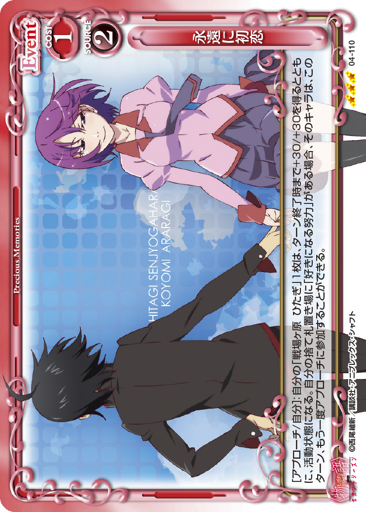 | [アプローチ/自分]:自分の「戦場ヶ原 ひたぎ」1枚は、ターン終了時まで+30/+30を得るとともに、活動状態になる。自分の捨て札置き場に「好きになる努力」がある場合、そのキャラは、このターン、もう一度アプローチに参加することができる。 | ||