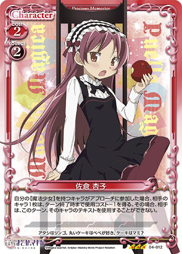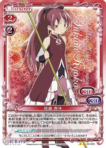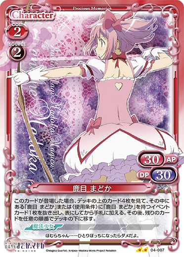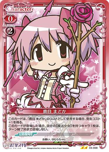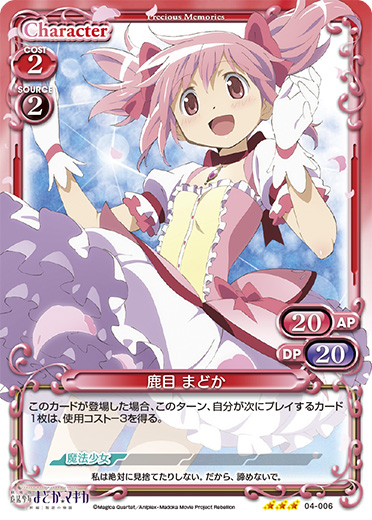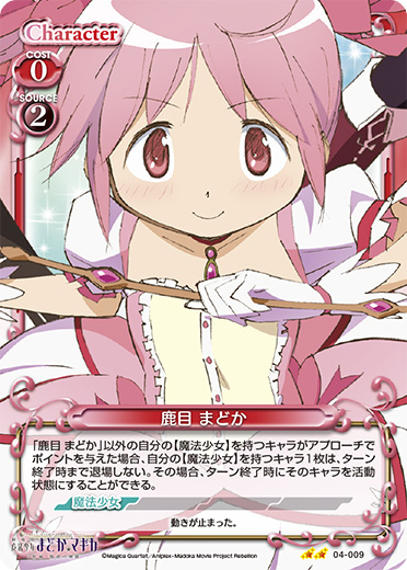 | このカードは、「鹿目 まどか」のコストとして使用する場合、発生コスト+1を得る。このカードが登場した場合、自分の【魔法少女】を持つキャラ1枚は、ターン終了時まで退場しない。 | ||