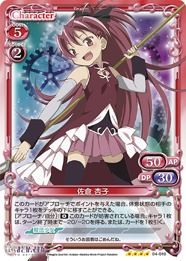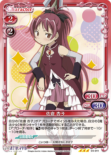 | 自分の「佐倉 杏子」がアプローチでポイントを与えた場合、自分の【魔法少女】を持つキャラ1枚を活動状態にすることができる。[アプローチ/相手]:《休》相手のキャラ1枚は、ターン終了時まで-10/-10を得る。 | ||
