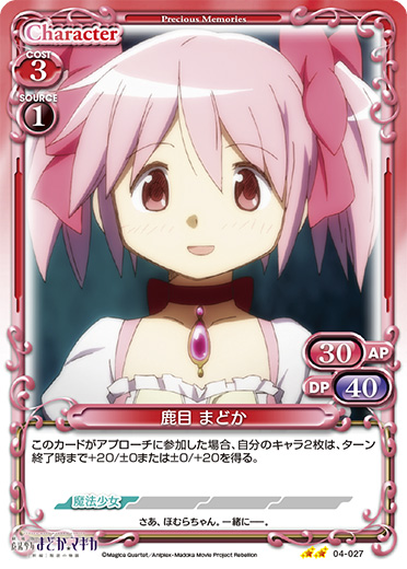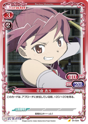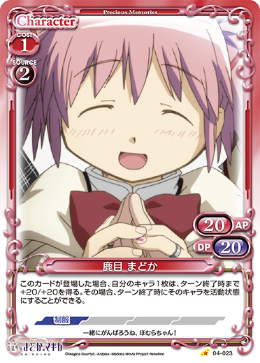 | このカードが登場した場合、自分のキャラ1枚は、ターン終了時まで+20/+20を得る。その場合、ターン終了時にそのキャラを活動状態にすることができる。 | ||