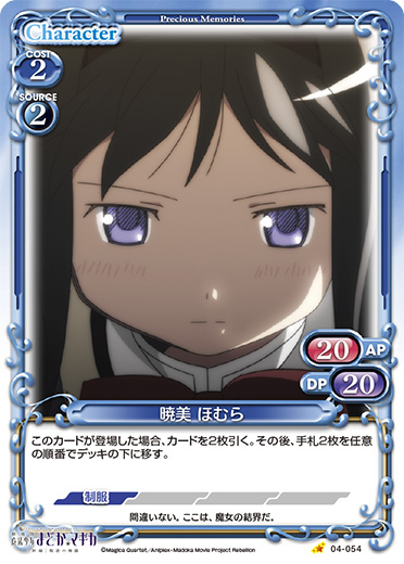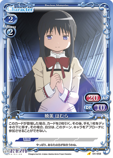 | このカードが登場した場合、カードを2枚引く。その後、手札1枚をデッキの下に移す。その場合、自分は、このターン、キャラをアプローチに参加させることができない。 | ||