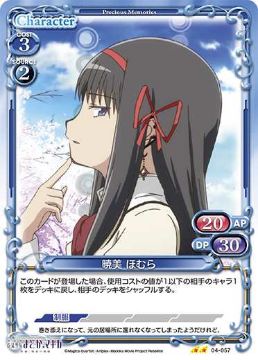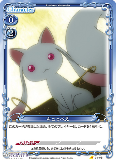 | このカードが登場した場合、使用コストの値が1以下の相手のキャラ1枚をデッキに戻し、相手のデッキをシャッフルする。 | ||