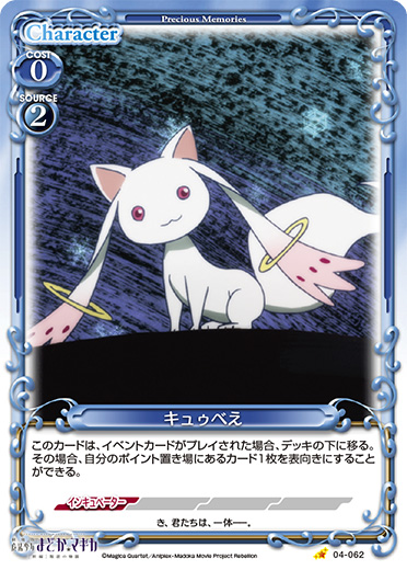 | このカードは、イベントカードがプレイされた場合、デッキの下に移る。その場合、自分のポイント置き場にあるカード1枚を表向きにすることができる。 | ||
