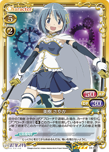 | 自分の「美樹 さやか」がアプローチで退場した場合、カードを1枚引く。[アプローチ/自分]:《0》このカードを妨害しているキャラ1枚は、ターン終了時までこのカードのAPと同じ値のAPのマイナスの修正を得る。 | ||