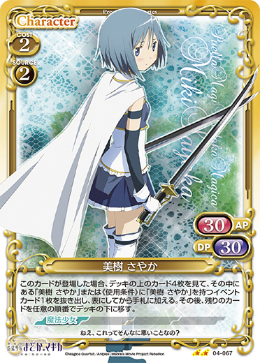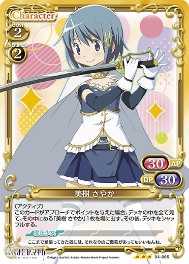 | 〔アクティブ〕このカードがアプローチでポイントを与えた場合、デッキの中を全て見て、その中にある「美樹 さやか」1枚を場に出す。その後、デッキをシャッフルする。 | ||