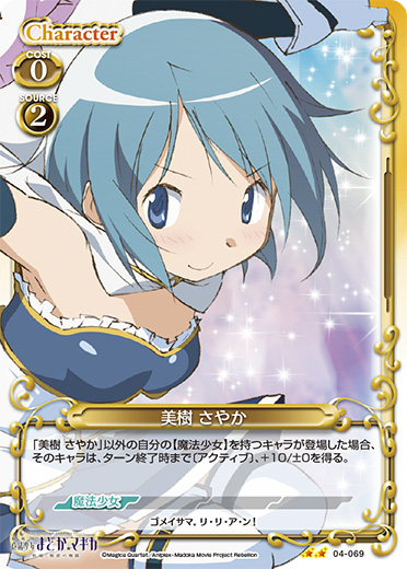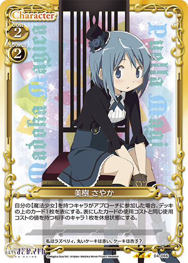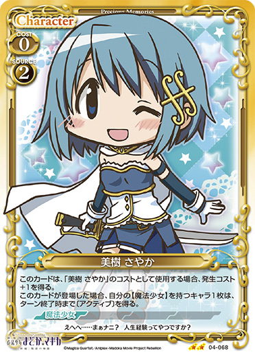 | このカードは、「美樹 さやか」のコストとして使用する場合、発生コスト+1を得る。このカードが登場した場合、自分の【魔法少女】を持つキャラ1枚は、ターン終了時まで〔アクティブ〕を得る。 | ||