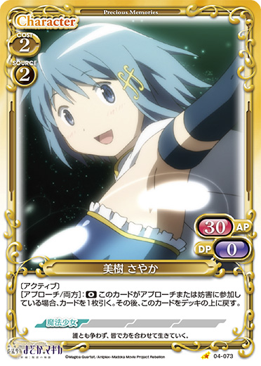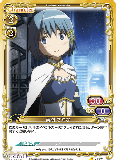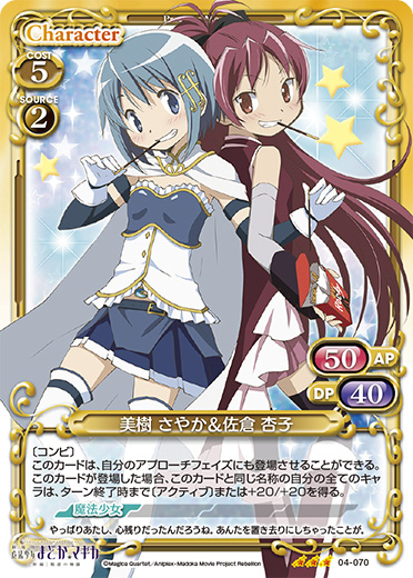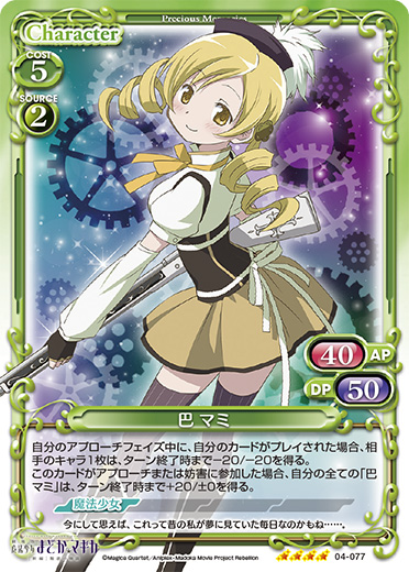 | 自分のアプローチフェイズ中に、自分のカードがプレイされた場合、相手のキャラ1枚は、ターン終了時まで-20/-20を得る。このカードがアプローチまたは妨害に参加した場合、自分の全ての「巴 マミ」は、ターン終了時まで+20/±0を得る。 | ||