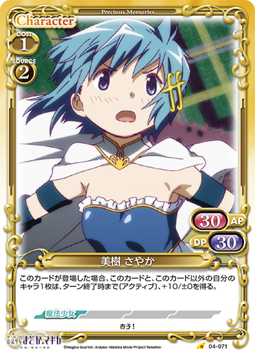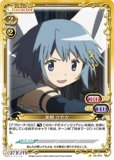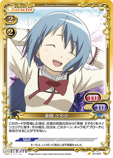 | このカードが登場した場合、任意の枚数の自分の「美樹 さやか」をメインエリアに移す。その場合、自分は、このターン、キャラをアプローチに参加させることができない。 | ||