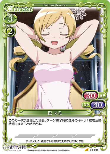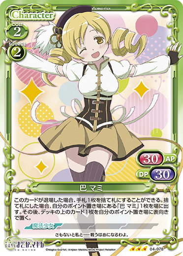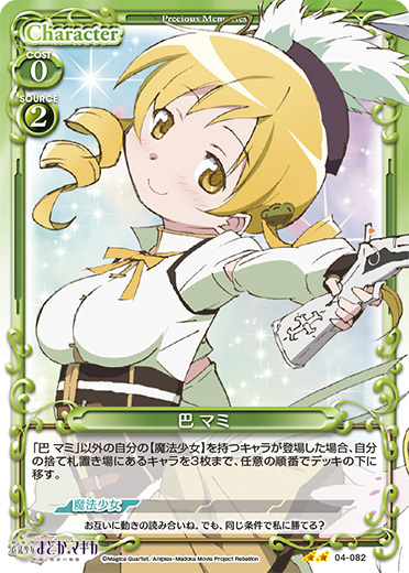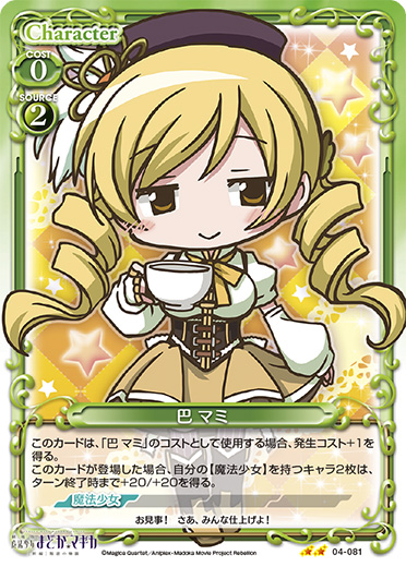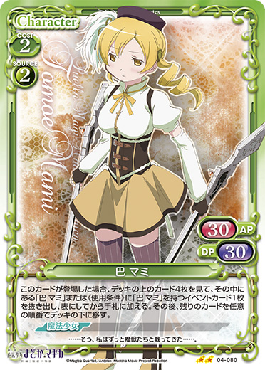 | このカードは、「巴 マミ」のコストとして使用する場合、発生コスト+1を得る。このカードが登場した場合、自分の【魔法少女】を持つキャラ2枚は、ターン終了時まで+20/+20を得る。 | ||