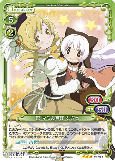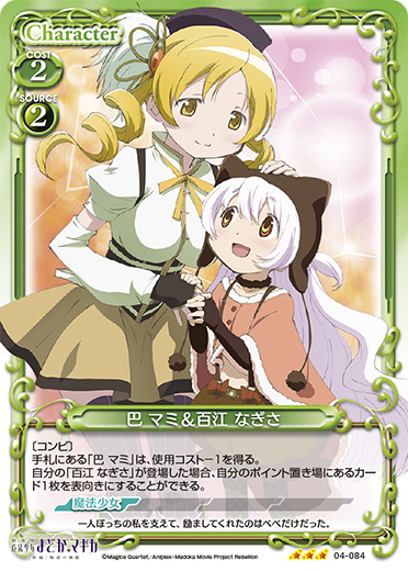 | 〔コンビ〕手札にある「巴 マミ」は、使用コスト-1を得る。自分の「百江 なぎさ」が登場した場合、自分のポイント置き場にあるカード1枚を表向きにすることができる。 | ||