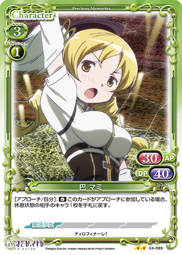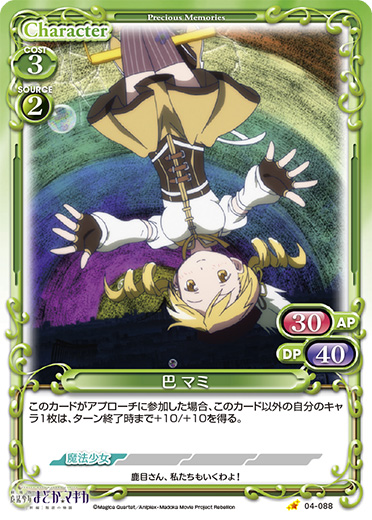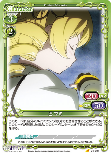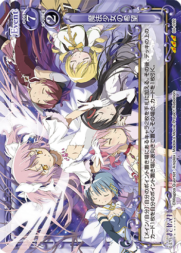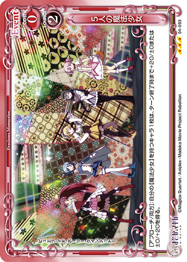 | [アプローチ/両方]:自分の【魔法少女】を持つキャラ1枚は、ターン終了時まで+20/±0または±0/+20を得る。 | ||
