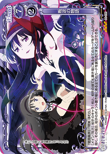 | 《使用条件》:「暁美 ほむら」[メイン/両方]:相手のキャラ1枚と、相手の捨て札置き場にある全てのカードをゲームから取り除く。その場合、相手のポイント置き場にある全てのカードを裏向きにすることができる。 | ||
