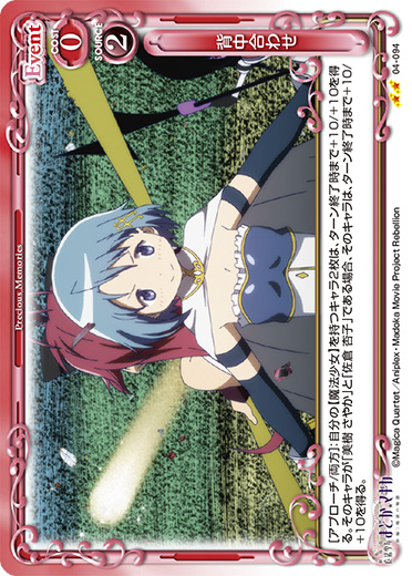 | [アプローチ/両方]:自分の【魔法少女】を持つキャラ2枚は、ターン終了時まで+10/+10を得る。そのキャラが「美樹 さやか」と「佐倉 杏子」である場合、そのキャラは、ターン終了時まで+10/+10を得る。 | ||