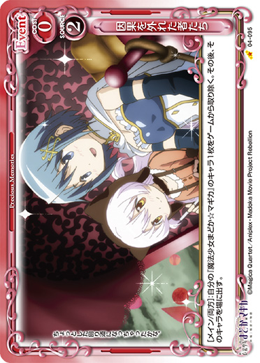 | [アプローチ/自分]:自分の「鹿目 まどか」1枚を指定する。このターン、そのキャラがアプローチでポイントを与えた場合、指定したカードと、自分のポイント置き場にあるカード1枚と、相手の捨て札置き場にある全てのカードをゲームから取り除く。 | ||