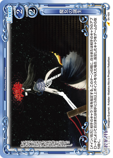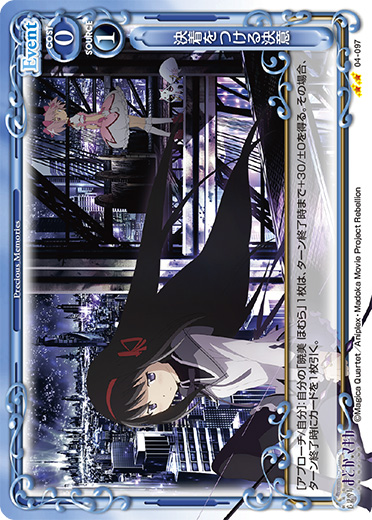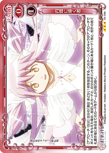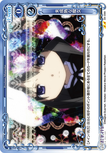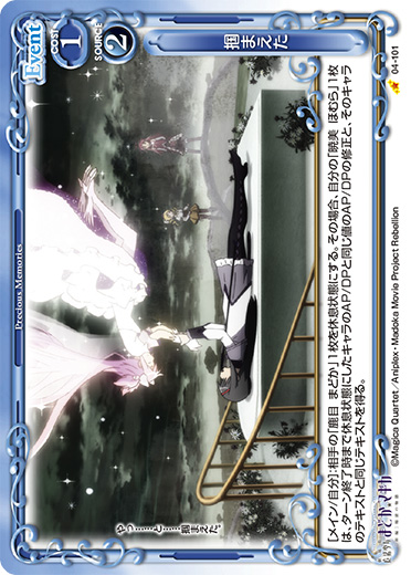 | [メイン/自分]:相手の「鹿目 まどか」1枚を休息状態にする。その場合、自分の「暁美 ほむら」1枚は、ターン終了時まで休息状態にしたキャラのAP/DPと同じ値のAP/DPの修正と、そのキャラのテキストと同じテキストを得る。 | ||