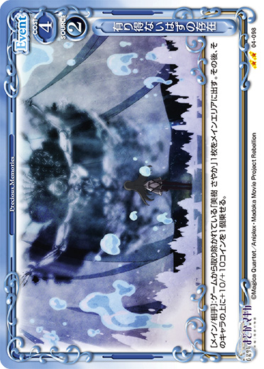 | [メイン/相手]:ゲームから取り除かれている「美樹 さやか」1枚をメインエリアに出す。その後、そのキャラの上に+10/+10コインを1個乗せる。 | ||