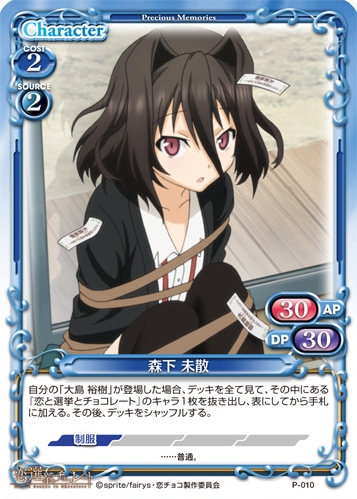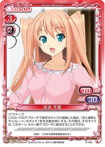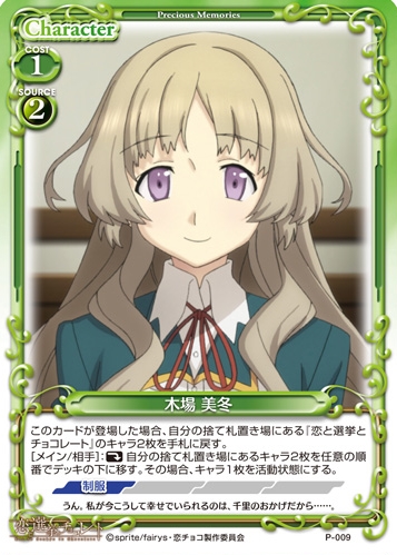 | 〔アクティブ〕 このカードのアプローチで相手のキャラが退場した場合、「恋と選挙とチョコレート」のキャラ1枚を活動状態にする。その場合、そのキャラは、このターン、もう一度アプローチに参加することができる。 | ||