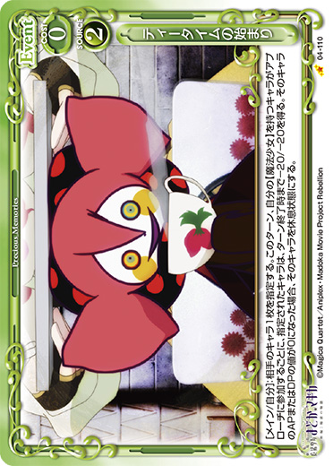 | [メイン/自分]:相手のキャラ1枚を指定する。このターン、自分の【魔法少女】を持つキャラがアプローチに参加するごとに、指定されたキャラは、ターン終了時まで-20/-20を得る。そのキャラのAPまたはDPの値が0になった場合、そのキャラを休息状態にする。 | ||