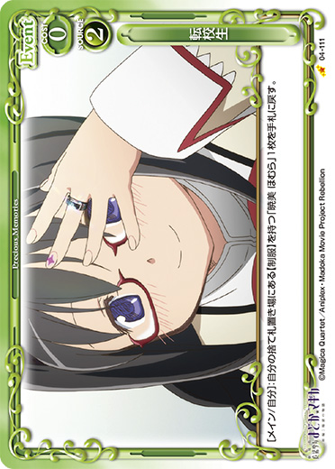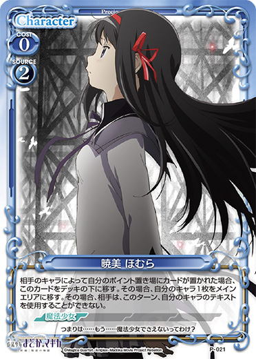 | [メイン/自分]:自分の捨て札置き場にある【制服】を持つ「暁美 ほむら」1枚を手札に戻す。 | ||