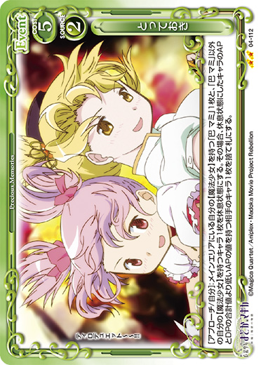 | [アプローチ/自分]:メインエリアにいる自分の【魔法少女】を持つ「巴 マミ」1枚と、「巴 マミ」以外の自分の【魔法少女】を持つキャラ1枚を休息状態にする。その場合、休息状態にしたキャラのAPとDPの合計値より低いAPの値を持つ相手のキャラ1枚を捨て札にする。 | ||